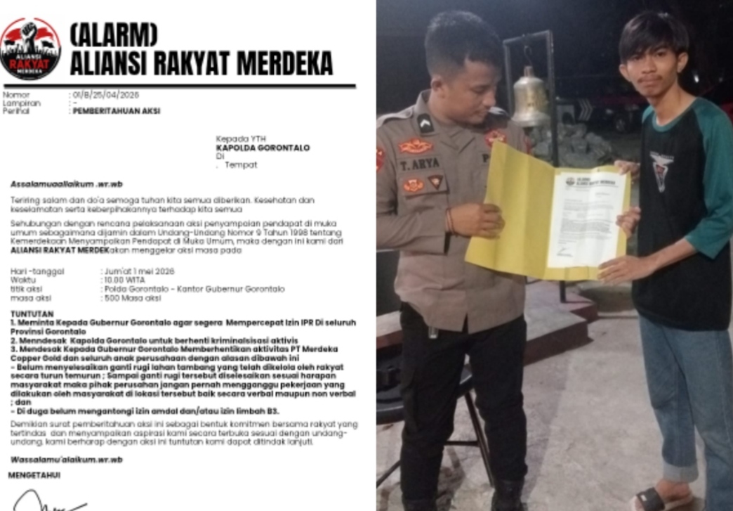 GORONTALO – Aliansi Rakyat Merdeka (ALARM) resmi melayangkan surat pemberitahuan aksi unjuk rasa yang rencananya akan digelar pada Jumat, 1 Mei 2026, pukul 10.00 WITA.
