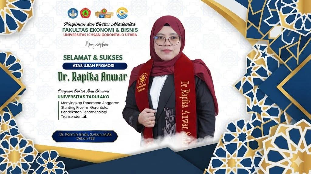 Dalam ujian terbuka tersebut, Rapika Anwar berhasil mempertahankan disertasinya yang berjudul “Menyingkap Fenomena Anggaran Stunting Provinsi Gorontalo: Pendekatan Fenomenologi Transendental.” Keberhasilan ini menandai bertambahnya dosen FEB UIGU yang menyandang gelar doktor, khususnya dalam bidang ekonomi dengan konsentrasi akuntansi.