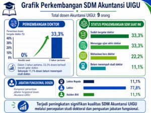 Berdasarkan data pengembangan SDM dosen, FEB UIGU menunjukkan perkembangan signifikan dalam peningkatan kualifikasi akademik dan jabatan fungsional. Dari total 9 dosen Akuntansi, pada kondisi awal belum terdapat dosen bergelar doktor. Namun, dalam tiga tahun pertama, 33,3% dosen telah berhasil meraih gelar doktor, 33,3% sedang menunggu ujian akhir doktor, 22,2% telah menjadi mahasiswa baru program doktor, dan hanya 11,1% yang belum menempuh studi doktor.